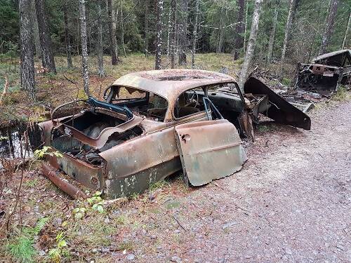 Als je zo door Zweden rijdt valt het ook meteen op dat er bij afgelegen huisjes soms veel auto's in de tuin staan die bij ons allang op de schroothoop zouden liggen, inmiddels weten we dat er in Zweden zelfs plekken bestaan (ook wel 'auto-kerkhof' genoemd) die je kan bezoeken waar auto's al zolang liggen dat ze weer bijna overgenomen zijn door de natuur.
